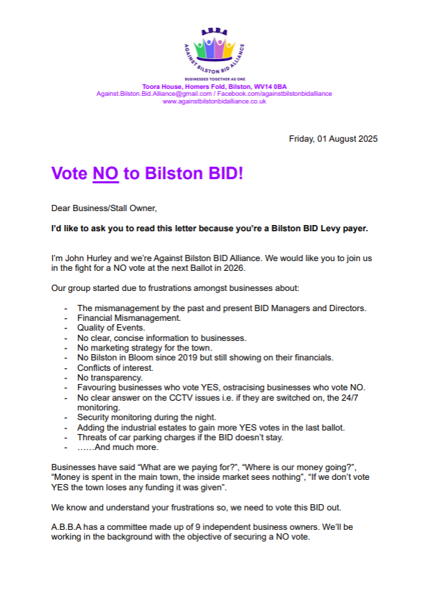 Letters have gone out to businesses to introduce A.B.B.A as a force to remove the BID from Bilston.