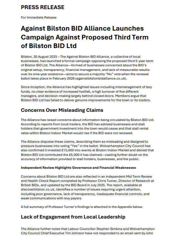 Against Bilston BID Alliance Launches Campaign Against Proposed Third Term of Bilston BID Ltd